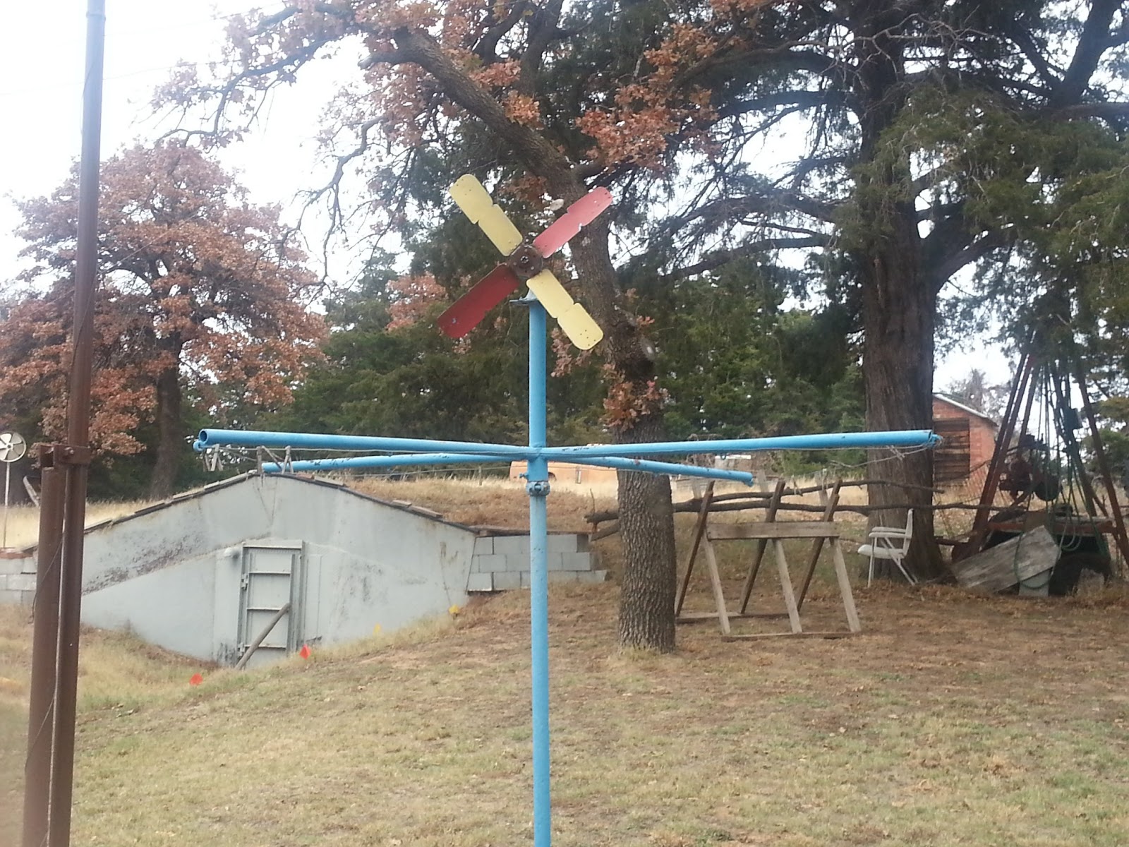In the back ground is a storm shelter he welded together and buried.